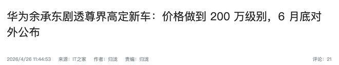 这个数字,是余承东在“鸿蒙智行会客厅”直播里亲口说出来的,而且语气很轻,但信息量不小,他甚至用了一句很有意思的话来形容这台车——“高定”。